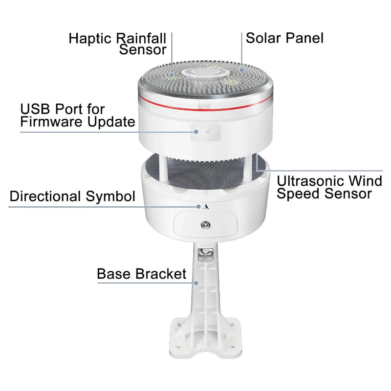 Included is the WS85 3-in-1 sensor array which transmits wind speed, wind direction and rainfall to the console. The sensor array also includes a solar panel to power the unit during daylight and extend the battery runtime. Along with the WS85 is the WH32 outdoor temperature and humidity sensor which can be placed in a location away from direct sun and sources for moisture for improved readings.