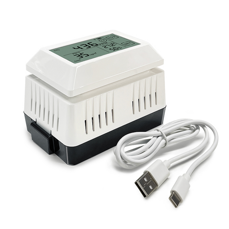 - Measures indoor PM1, PM2.5, PM4, PM10, CO2 concentration, Temperature and Humidity every 60 seconds when powered by USB or every 10 minutes when powered with batteries (required)